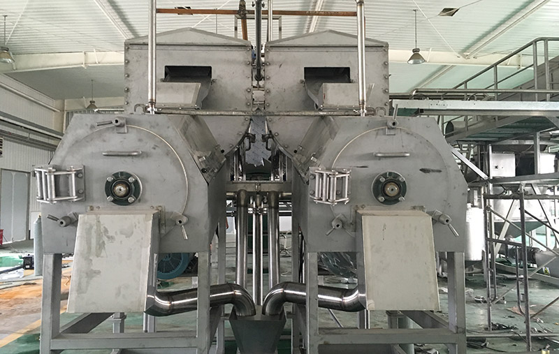 6. 去核制浆:经过破碎机初破碎的红枣通过螺杆泵进入去核制浆机的青青草激情在线视频室内,通过青青草激情在线视频叶片的高速旋转作用下使物料获得离心力而抛向筛网,物料在青青草激情在线视频叶片与筛网 进行产生相对运动的过程中因受到离心力以及揉搓作用而被进一步打击成浆,物料经筛网孔进入收集器,再由螺杆泵输送至下一工序,而渣皮、果核等则由出渣斗排出。