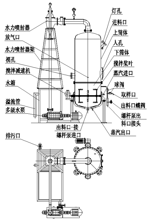 该机主要由筒体、蒸汽加热室、多级水泵、减速机、水力喷射器、水箱等组成。