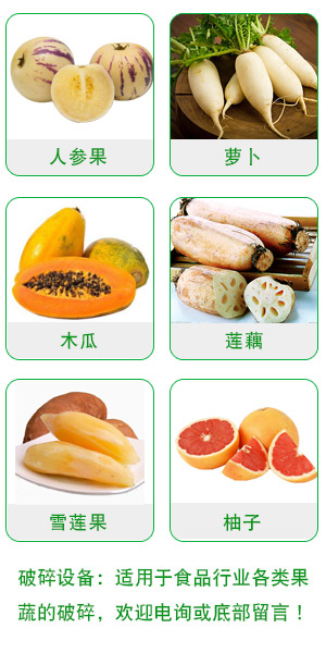 该设备是利用高速旋转的刀片对物料进行破碎。该机具有结构简单,节能高效,生产能力大等特点。适用于各类果蔬的破碎。
