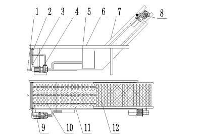1、排污阀 2、冲洗总管 3、水泡总管 4、循环水泵 5、水过滤箱 6、水箱 7、提升机架 8、调速减速机 9、冲洗喷嘴 10、水泡支管 11、防沉网 12、提升网带
