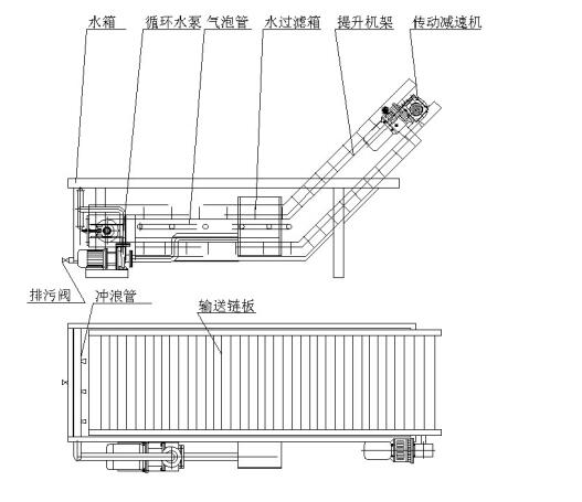 该机由水箱、提升机、循环冲洗水泵、传动部分等部件组成,工作时物料直接被倒在输送链板上,在水箱中输送;而又由于输送链板底部设有气泡管,使物料产生翻滚,从而清洗物料。水箱内的水经过水过滤箱过滤后,由循环水泵通向冲浪管和气泡管。本机也可根据用户要求在提升段和水箱上部加设喷淋管。