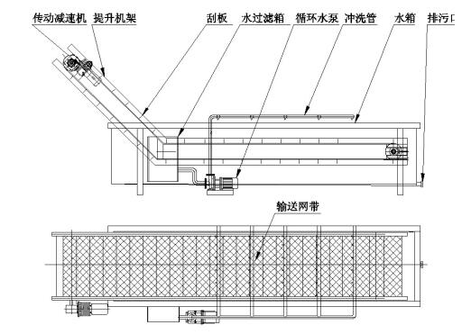 该机由水箱、提升机、循环冲洗水泵、传动部分等部件组成,工作时物料直接被倒在输送链板上,在水箱中输送;而又由于输送网带上部设有冲洗管,使物料水的冲击下产生翻滚,从而清洗物料。水箱内的水经过水过滤箱过滤后,由循环水泵通向冲洗管。本机也可根据用户要求在提升段和水箱上部加设喷淋管。