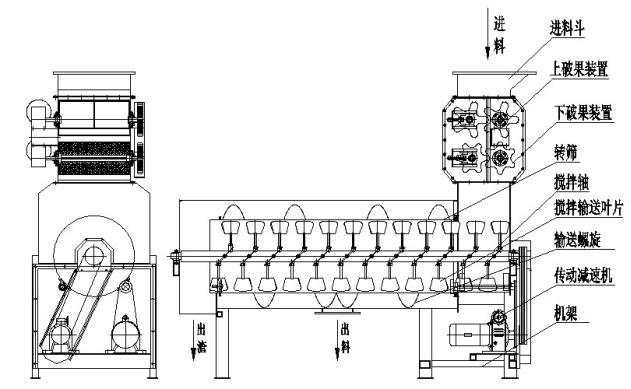 该石榴破壳分离机主要由进料斗、上破果装置、下破果装置、转筛、搅拌轴、输送螺旋、机架等部件组成。本机除传动部分外其余为不锈钢制造,搅拌轴无级调速。