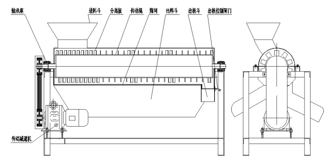 该设备主要用于核果类的核肉分离。例如:橄榄、青梅、李子、杏子、桃等。水果通过转子上不同角度的分离板,得到块状果肉,从筛网孔中落入出料斗,核由数个分离板组成的螺旋,向出核处排出。筛网和分离板之间的间隙,视处理物料核的大小而定。