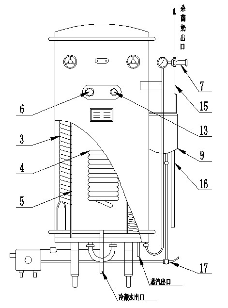 图2绘出了物料的灭菌过程。物料通过供料泵(2)进入双套盘管(3)的外层流道、由内层流出的热料的间接加热而得到预热,当物料进入设置在高温桶(5)内的高温盘管(4)时,由于桶内的蒸汽间接加热而被加热到需要的灭菌温度,然后在桶外单旋管内保温而使物料的细菌被杀灭,当回到双套盘管(3)时,物料便进入内层流道,被外层冷料所冷却,从而使出料温度显著下降(一般低于65℃)。如工艺上需要提高或降低出料温度时,可启用角式截止阀(12),让它接通热源(蒸汽)或冷源(水、或冰水等),让它们进入双套管下端的外层流道。