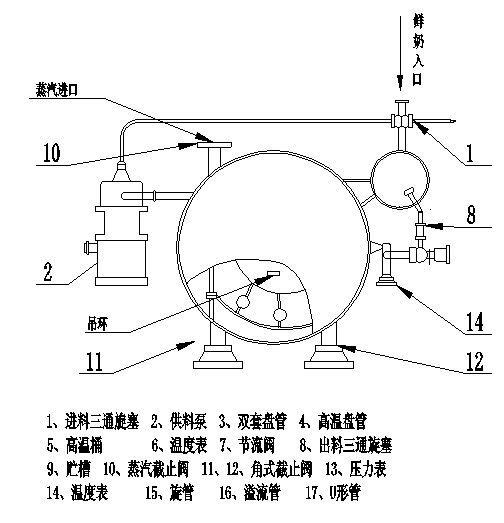超高温瞬时灭菌机的结构见图1,在主机内装着压力容器--高温桶(5)、用作充盛压力蒸汽。桶外的主要设置时螺旋形双套管(3),用作对进、出物料的冷热交换;桶内的主要设置是螺旋形单管(4),用作间接受热。
