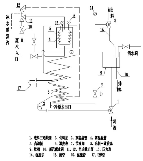 节流阀(7)是可以调节的,一方面使物料维持在一定的压力之下,让其沸点温度提高,以防止淡化;另一方面,也作调节流量用。物料zui后经三通旋塞(8)出料。该旋塞下端接着旋管(15)、其出口对着贮槽(9),当需要时,可旋动旋管对转溢流管(16)。进料三通旋塞(1)的上端与贮槽(9)接通,下端则与料源管道相连接。