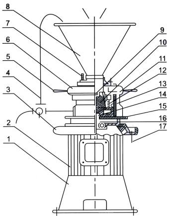 1、底座 2、电机 3、端盖 4、循环管 5、手柄 6、调节盘 7、冷却水接头 8、加料门 9、旋叶刀 10、动磨盘 11、静磨盘 12、静磨盘座 13、O型圈 14、机械密封 15、壳体 16、组合密封 17、排漏管接头