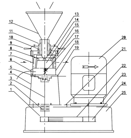 1、从动带轮 2、轴承 3、主轴 4、机座 5、轴承 6、出料口 7、冷却水接头 8、进料盖板 9、手柄 10、轴承 11、限位螺母 12、加料门 13、旋叶刀 14、动磨盘 15、静磨盘 16、调节盘 17、机械密封 18、壳体 19、排泄孔 20、电机 21、调节螺钉 22、三角皮 23、电机座 24、主动带轮 25、底座