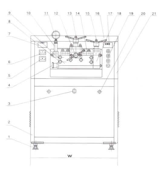 1.底脚    2.出水口   3.拉派    4.进料口    5.电流表    6.电压表  7.铭牌   8.泵体螺母   9.泵体    10.传压缸    11.压力表   12.高压手枪    13.低压手枪      14.压盖    15.溢流阀手枪    16.上盖    17.标牌    18. 溢流阀体    19.电源开关     20.电器箱门锁      21.外罩