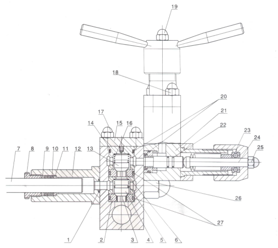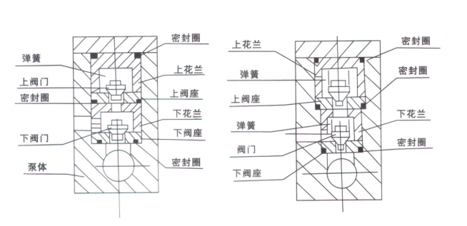 1.O型圈、密封垫圈    2.下阀座    3.导向杆      4.下阀门    5.下阀门弹簧    6.下花兰   7.柱塞   8.紧定螺钉   9.压环    10. 柱塞密封圈 (V型或方型 、隔离片)  11.定位套、垫环    12. 柱塞密封套    13.上阀门    14.上兰花      15.压板    16.上阀门弹簧      17.螺栓、螺母        18. 螺栓、螺母      19.加压杆螺母     20.O型圈、密封圈    21.一ji均质阀体    22.均质杆、O型圈        23.平面轴承        24.加压杆    25.加压杆螺母       26.泵体螺母    27.上、下阀门密封圈