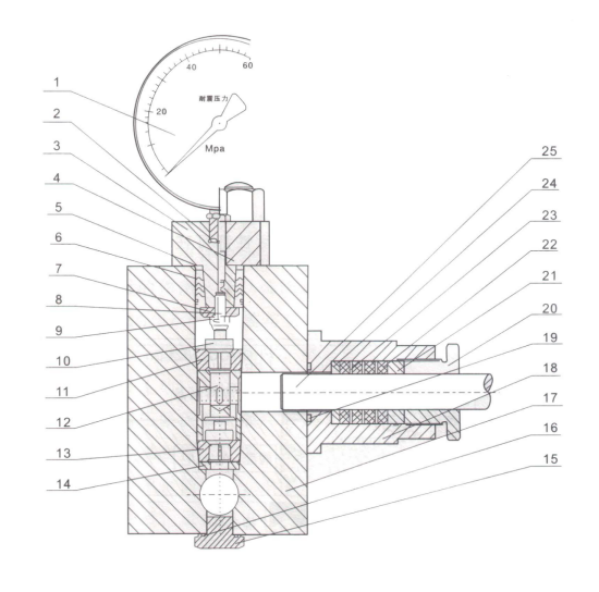1.压力表组件  2.表座密封垫  3.表座压盖  4.压盖  5.圆锥柱 6.压盖密封垫  7.紧锁螺帽  8.调节螺帽  9.带孔紧锁螺帽    10.锥阀芯   11.上锥阀座   12.限位套   13. 下锥阀座     14.调整垫片  15.螺塞   16.O型橡胶密封圈    17.泵体      18.柱塞密封套  19.泵体平面密封圈  20.紧定螺钉  21.压环    22.柱塞密封圈 (V型或方型) 23.隔离片  24.座环  25.柱塞