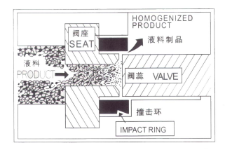 GJJ系列高压均质机是一种超细粉碎,乳化匀浆设备,它利用高压条件下的混悬液,通过一个可调节的限流缝隙过程中失压、膨胀、爆炸、剪切和高速撞击等综合效应,将在液体中的颗粒和油滴粉碎成很小尺寸,直径Ø0.1-2um,平均Ø≤1um,同时建立理想的乳化液或分散液。这个过程集超声波粉碎机、胶体磨、球磨机、射流机等功能原理于一体(图3)。产品的稳定性、一致性、混合性、易吸收性、营养值、保质期、口味、色彩和保活性都可在均质机得以实现。