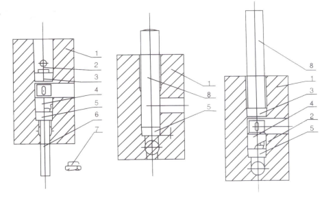 1.泵体     2.椎阀芯   3.上椎阀座   4.限位套   5.下椎阀座    6.敲棒      7.螺塞     8.敲棒(附件3)