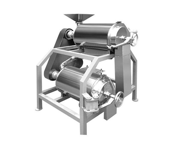电机由皮带驱动,使安装在花键上的刮刀高速旋转。当破碎的水果通过进料口进入机器时,收料盘将物料均匀地卸到刮板和筛网上。由于刮刀的旋转作用和导角的存在,物料沿圆筒移动到出口端,运动轨迹呈螺旋状,物料在刮板和筛筒之间的移动过程中受到离心力的挤压,果汁、肉(已成浆)经筛孔送至下道工序(双打、三打联动重复上述工序)皮、籽等,然后从渣斗排出,达到自动分离的目的。