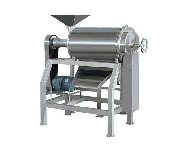 一。单道青青草激情在线视频机:主要由圆筒筛、碎浆刀、刮刀、轴、机架及传动系统组成。圆筒筛是两端开孔的渣汁分离装置,水平安装在壳体内,固定在框架上。采用0.351mm厚不锈钢制成,孔径范围0.4-1.5mm,开孔率约50%。在传动系统驱动的轴上依次安装螺旋推进器、破碎叶片和刮刀。刮板实际上是一个长方形的不锈钢板,由支架固定在轴上。通常有两个刮板。每个刮刀和轴之间有一个夹角,称为铅角。刮板与圆筒筛内壁之间的距离可用螺栓调整。为了防止刮板损坏滚筒筛,有时在刮板上安装耐酸橡胶板。在单青青草激情在线视频机的工作过程中,物料从进料斗进入筛筒,电机带动刮板通过传动系统旋转。由于刮刀旋转和导引角的存在,物料沿刮板缸与筛筒之间沿缸壁向出口端移动,运动轨迹为螺旋线。在物料运动过程中,由于离心力的作用,果汁和肉浆从圆筒筛的孔中流出,流入集料斗1下端的储液桶。料皮、籽等废料从圆筒筛左端出渣口卸下。