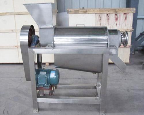 螺旋主轴的旋转方向是顺时针方向从进料料斗到渣槽。当原料加入进料料斗并在螺杆推进下加压时,挤压的果汁通过滤网流入底部的果汁架,而废料则通过螺杆与压力调节的锥形部分之间形成的环形间隙排出,而间隙的大小可以通过压力调节头沿轴向的移动来调节。按顺时针方向使用(从设备的排渣槽到进料桶末端的手轮轴承座,压力调节头向左转动,间隙减小,反之,间隙变大。)改变间隙的大小,即调节排渣阻力。渣率可以改变,但如果间隙太小,在强挤压下,渣中的一些颗粒会通过过滤器与果汁一起挤压出来。虽然果汁有所增加,但果汁的质量相对下降,应根据用户的具体工艺要求来确定间隙的大小。