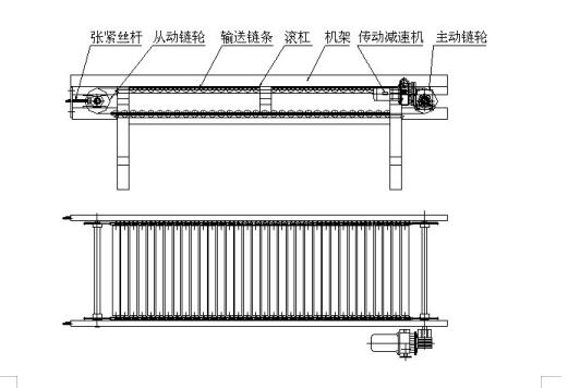 该机主要由机架、输送链条、滚杠、主动链轮、从动链轮、传动减速机等重要部件组成。